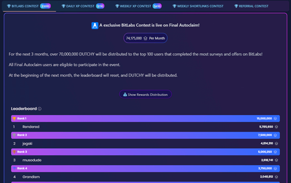 There’s a contest for top earners for the Bitlabs offerwall, as well as daily and weekly XP gainers. There’s also a contest for the most shortlinks done and most referrals earned. The prizes are quite significant, so if you manage to win, you will receive a good amount of DUTCHY tokens.
